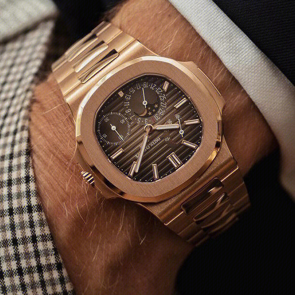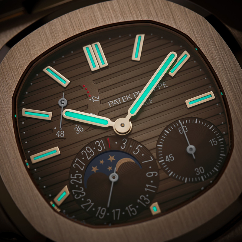 The famous Ref. 5712/1R-001 Nautilus with an analog date, moon phases, and a power-reserve indicator presents sporty appeal and elegance; it features a case and bracelet in rose gold with a brown sunburst dial and a black gradation.