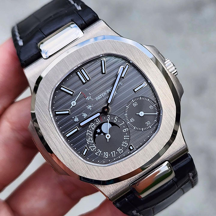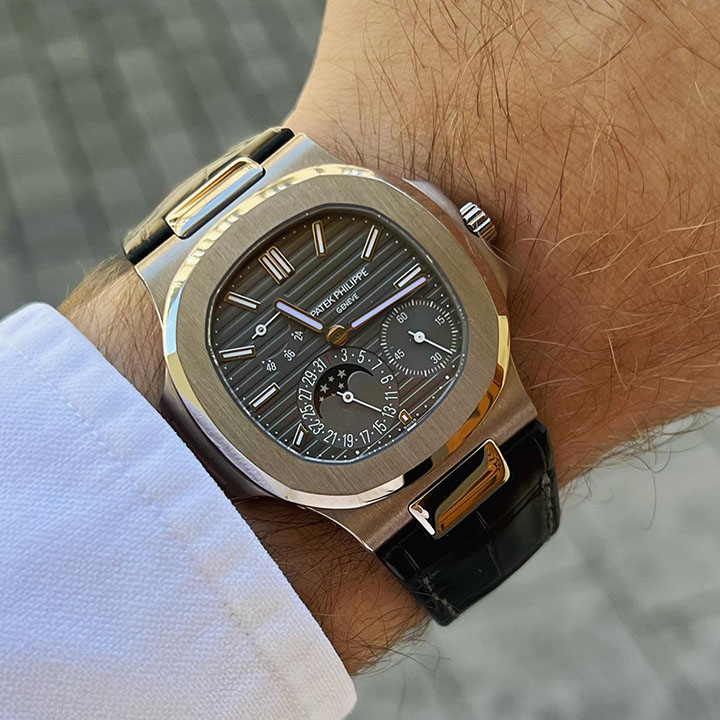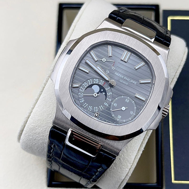 Two popular complications, the moon phase and power-reserve display, give the nautical-inspired 5712G-001 a unique technical charm and add a vibrant personality to the classic horizontally embossed dial. Its 18k white gold case measures 40.0 x 8.52 millimeters and is water-resistant up to 60 meters, while inside that case there is a 240 PS IRM C LU automatic caliber ensuring precision. The sapphire-crystal case back exposes the exquisite finish and decentralized miniature rotor made of 22k gold.