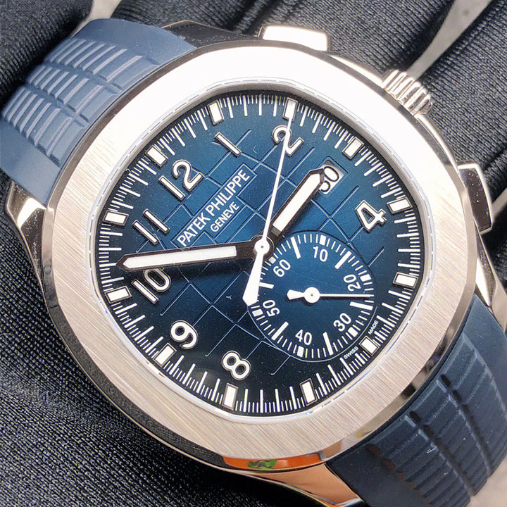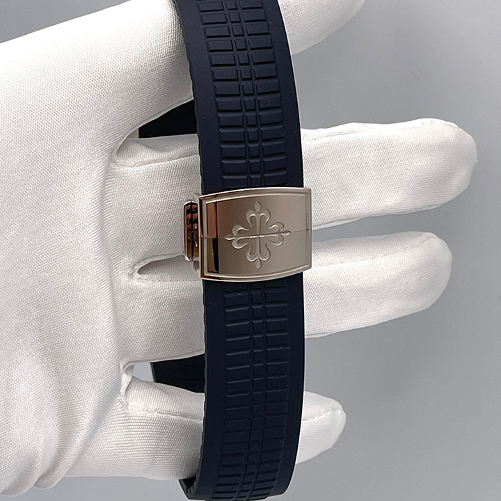 Patek Philippe is reasserting the "contemporary casual chic" spirit of the Aquanaut flyback chronograph with the first white gold version of this self-winding model, combined with an elegant midnight blue color for the dial and matching composite strap. The dial is enlivened by a black-gradient rim. Water-resistant to 120 m, the case is enhanced by polished and satin finishes. The 60-minute counter at 6 o'clock picks up the rounded octagonal shape of the bezel. The patented fold-over clasp is secured by four independent catches.