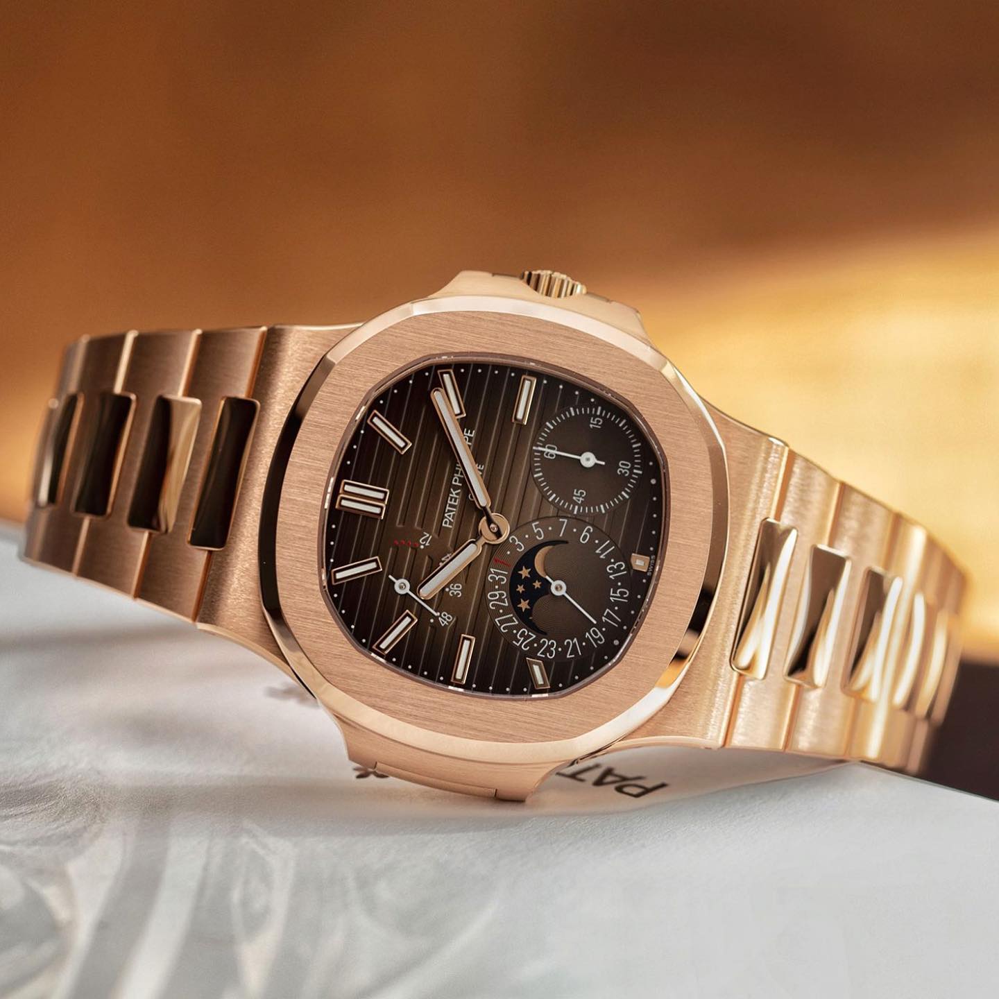 The famous Ref. 5712/1R-001 Nautilus with an analog date, moon phases, and a power-reserve indicator presents sporty appeal and elegance; it features a case and bracelet in rose gold with a brown sunburst dial and a black gradation.