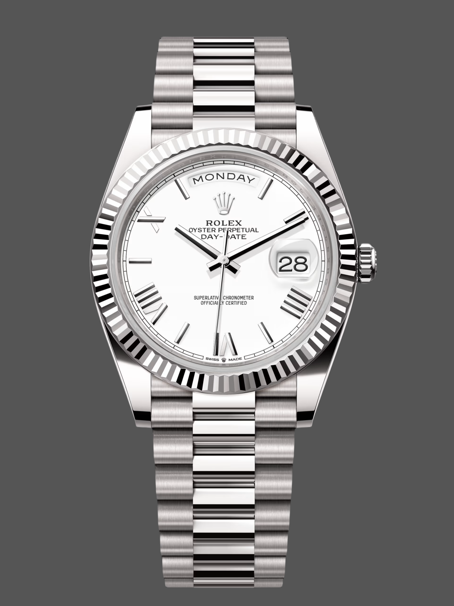 Rolex Day-Date 228239 White Roman Dial Fluted Bezel 40mm Mens Replica Watch